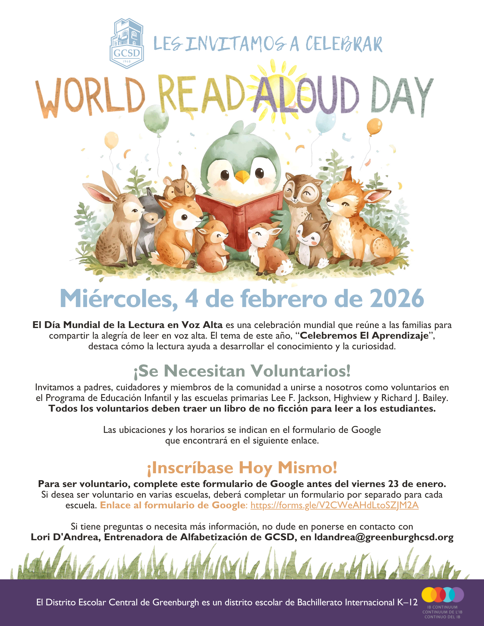 ¡Acompáñenos el 4 de febrero para el Día Mundial de la Lectura en Voz Alta! Estamos buscando padres y miembros de la comunidad que deseen leer en voz alta y ayudar a inspirar el amor por los libros en nuestros estudiantes. Inscríbase y celebre con nosotros la alegría de la lectura. Por favor haga clic aqui para registarse.